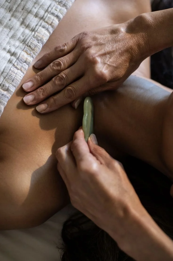 Gua Sha Treatment: Using a sterilized gua sha tool, your therapist works through a structured routine covering the neck, jawline, cheeks, eyes, and forehead.